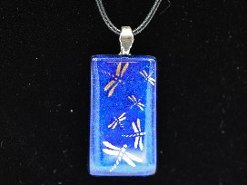Handmade blue dichroic glass pendant with gold dragonflies and sterling silver bezel.