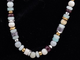 Stella and Dot adjustable beaded necklace on silver-toned chain with tassels on ends. Muted blue, silver, and earth-tone beads.