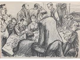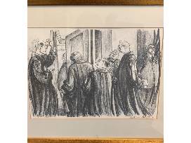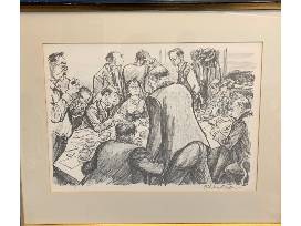 The highest bidder will win two beautiful prints from famed illustrator William Sharpe. Both prints measure 14 3/4" x 18" and are framed and matted. After his service in World War I, Sharpe became a famed illustrator in Berlin. His biting political cartoons provoked threats of imprisonment from the National Socialists. He fled to the United States under a new identity and found work as a courtroom artist and a staff artist at Esquire Magazine.