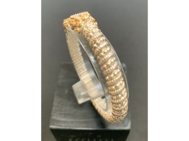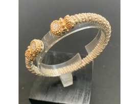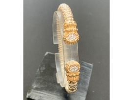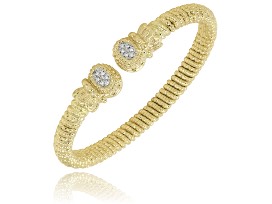This 14 karat yellow gold and sterling silver Alwand Vahan fashion diamond bracelet features 12 round brilliant cut diamonds with a total carat weight of .09cts that are graded SI in clarity and G-H in color. The bracelet is finished with Vahan's trademark Moire beading giving it a timeless look.