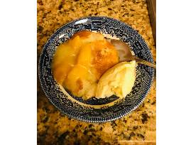 - Gently place peach slices on top of batter and butter throughout pan. DO NOT STIR.