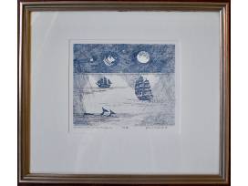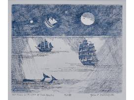 Retired art professor and artist John Lochtefeld has called Nantucket home for the last half century. "I took one look at the island after stepping off the boat and I knew," he said in a 2009 interview. John finds inspiration in stories and tales of the sea, in folk songs about Nantucket, and the whaling industry. This whimsical, limited edition print is a Lochtefeld and a Nantucket classic, depicting whaleships in their quest for oil. This print is a rarity, as John now focuses more on painting and sculpting rather than printmaking.