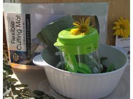 Also included are an oven mitt, measuring cups & spoons, two dish rags, mug, ice cube tray, plastic fork, flexible cutting mat, spatula, storage container, and a mixing bowl.