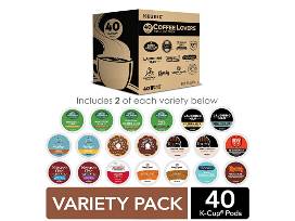 - 40 pods of Keurig Coffee Lovers Variety Pack: 2 K Cup pods from 20 popular varieties, including Green Mountain Coffee Breakfast Blend, The Original Donut Shop Regular, Newman's Own Organic Special Blend, Caribou Coffee Caribou Blend, Tully's Coffee Italian Roast, and many more.