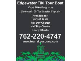 Sunday Funday? Family Reunion? Birthday Celebration? Whatever the occasion, Edgewater Tours will provide you the most merry way to enjoy a Lake Oconee Tour on a 28 foot Tiki Boat! Choose to tour Lake Oconee, anchor out and enjoy the sand bar, and sun on a lily pad, or choose from a variety of floats to enjoy! It's your choice for a half-day in the sun provided by Edgewater Tours of Greensboro, GA. This half-day charter is a great way to entertain your friends.