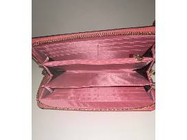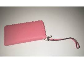 Pink leather wristlet measures 7.5x4" in size, has three compartments, area for credit cards, optional wristband, zipper pouch and zipper closure.