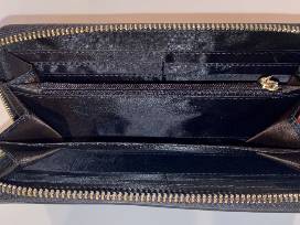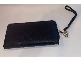 Black leather wristlet measures 7.5x4" in size, has three compartments with area for credit cards, optional wristband, zipper pouch and zipper closure.