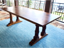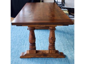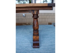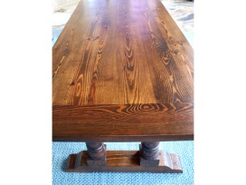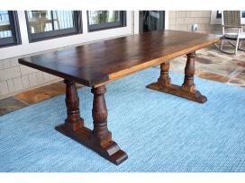 Brand new, custom made, handcrafted Carolina Farmstead table. Made of reclaimed pine and finished with a marine-grade stain for indoor or outdoor use. Pedestal legs are removable for easy relocating.