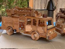 When I had my first and second grandsons, I started to craft toys. It became an obsession and I have continued to produce and show these in a variety of venues. There are now over ten types of vehicles that I created from just a photo, no blueprints necessary or available. I also make my own wheel to this 1 ½+ foot wooden structures. Other current work I have displayed are 2 D assemblages of wood shapes taken from the scraps left after the trucks are finished.