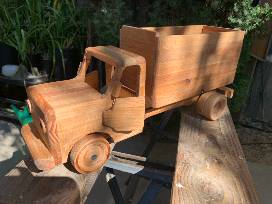 When I had my first and second grandsons, I started to craft toys. It became an obsession and I have continued to produce and show these in a variety of venues. There are now over ten types of vehicles that I created from just a photo, no blueprints necessary or available. I also make my own wheel to this 1 ½+ foot wooden structures. Other current work I have displayed are 2 D assemblages of wood shapes taken from the scraps left after the trucks are finished.