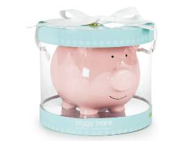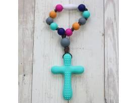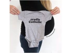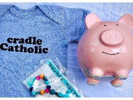 Perfect gifts for your Catholic baby. A 12-month onesie in heather gray from Brick House in the City. A Chews Life decade rosary made of chewable food-grade silicone beads and strung on organic cotton cord, and a pear head piggy bank.