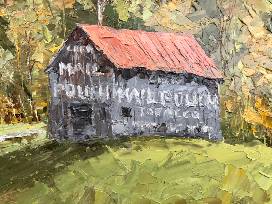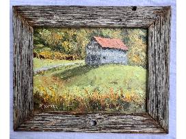 This oil painting is part of The Ohio Barn Project. The painting is in oil, impasto technique, and is mounted in a frame from rustic barn wood. This also comes with an essay describing the barn, its history, and flavorful stories at www.barnart.weebly.com.