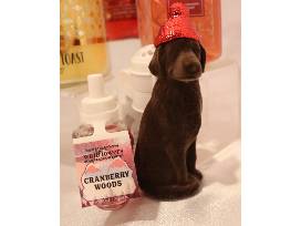 Champagne Toast Scented 3 Wick Candle, White Jasmine lotion 3 oz, Snowflakes & Cashmere Shower Gel 3 oz, Champagne Toast Foaming Hand Soap, Black Lab Wallflower holder and Cranberry woods insert.
