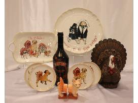 Pumpkin Spice Bailey's, 4 Turkey/Dog plates, Turkey Statue, Turkey/Dog salt & pepper shaker, The Gobblers serving dish and "You Gonna Eat All That Turkey?" plate