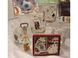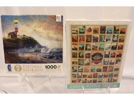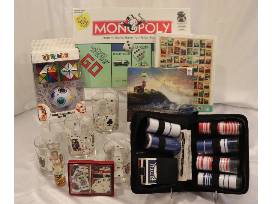 Monopoly board game, Poker Chips and cards, 4 card themed rock glasses, Rubik's Challenge Gift Set and Thomas Kinkade 1000 piece puzzle, National Parks puzzle 1000 piece.