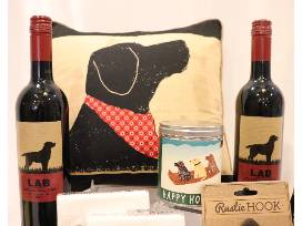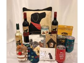 Black Lab pillow, 2 Lab Red 2015 wine, 1 bottle of Lab White Wine, 2 Travel Tumblers 16 oz, Dog Mountain Candle, 2 pair Christmas Socks, 2 Lab Christmas Guest Towels, 1 printed canvas note card, Acana dog treats, rustic hook.