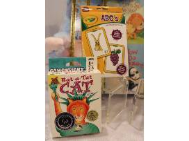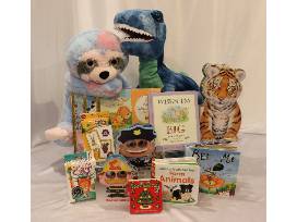 Rat a Tat Cat Game, Crayola Flash Cards, Plush Dinosaur, 3 Golden Books, 5 board books, When I am Big and Little Tiger books, Plush Sloth
