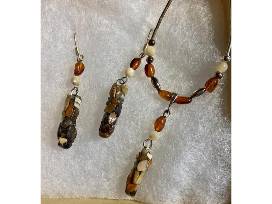 Necklace and earring set with seashell cases. One of a kind jewelry made by Macroinvertebrate (specifically caddisflies). This necklace and earring set is built from woven cocoons using precious metals and gemstones.