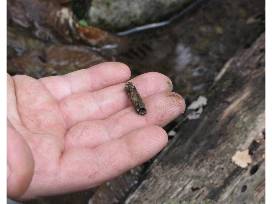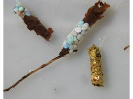 In the spring, with a case about 1" in length, the caddisfly is ready to transition into its stone case. The caddisfly will then start adding stones to its leaf case