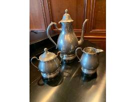 This pewter tea service is beautifully rendered from the workshop of Brooklyn's Queen Art Studio. Highly desirable to collectors, the work from "Danish Quality" artisand Anton Thuerer and Frederch Bauer, represented the finest of American made 20th century craftmanship.