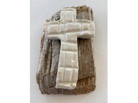 0This a ceramic cross on weathered wood measuring 3.5" x 2" made by Poppy Greene (8 years) for St. Paul's.