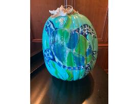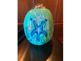 PRICE ADJUSTMENT! This beautiful pumpkin was painted by artist Rose Thompson and purchased for our auction by Milena Glancy. With a sea turtle on one side and a starfish on the other, it is a true work of art.