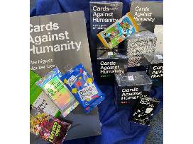 The ultimate full set of Cards Against Humanity, including the original deck, the red, blue, green, and absurd expansion sets, foil packs, and a storage box.