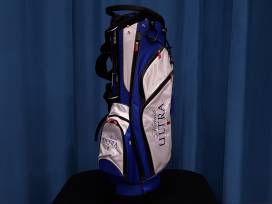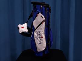 Michelob Ultra logo collectible golf bag in blue, black and white. Multiple pockets including scorecard keeper. Padded shoulder straps for easy carry and sturdy frame for durability.
