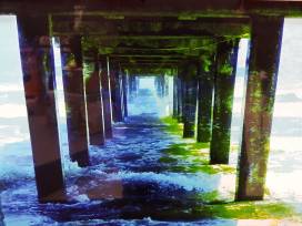 Limited edition print of the photograph "The Gateway Pier" is a beautiful image of shades of blue and green. Photograph was taken by Michael Catlin, an artist from Rockport. The white wood distressed frame makes the print really stand out. With the frame, this print measures 24 inches by 14 inches. This print includes a certificate of authenticity.