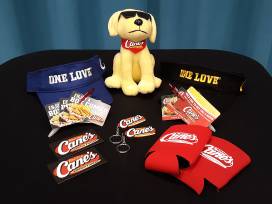 Satisfy your chicken finger craving with this awesome gift basket filled with Raising Cane's loot! Basket includes 2 key chains, 1 plush Cane puppy, 1 medium royal t-shirt, 1 medium charcoal t-shirt, 2 koozies, 3 box combo cards, 1 lemonade card, 4 magnets, 2 chapsticks, 2 pens, and 2 hats/visors. Cards do not expire.
