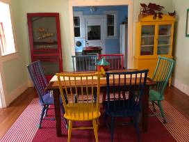 You will appreciate the original pine floors and wooden windows throughout, as well as the exposed brick beam, shiplap walls and custom-made wood cabinets, countertops and backsplash in The Bungalow's rustic kitchen.