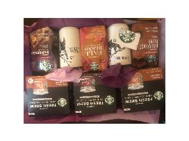 2-Fresh Brew Ground Coffee(8 cans/each)-Medium Roast; 1- Fresh Brew Ground Coffee(8 cans)-Dark Roast; Fall Blend 10 oz coffee bag; Breakfast Blen 10 oz coffee bag; Expresso Roast 10oz coffee bag; $40 Starbucks Gift Card; 2 coffee mugs; 1 breakfast tray