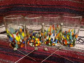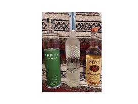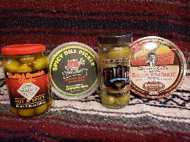 Tito's, Effen Cucumber and Belvidere vodkas. Sucker Punch gourmet spicy, Miss Mary's thick and savory morning elixir and Larry the Cable Guy Git er Done mixes. Blue cheese stuffed olives and Tabasco hot & spicy Spanish olives. Spicy dill pickle rim shot and bacon rim shot. Set of 10 antique silver skull cocktail picks. Set of four handmade confetti glasses. Metal ice bucket.
