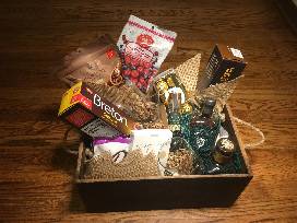 Journeyman Distillery Silver Cross Whiskey, Michter's Small Batch Whiskey, Wilderness Trail Whiskey, four pack of tumblers, "Whisky Stones" Beverage Cubes, Hazelnut Chocolates, 2 Boxes of Entertaining Crackers, Maple Pecan Caramel Corn, Dark Chocolate Almonds, Dried Fruit, Sun Dried Figs, Decorative Wooden Crate with Chalkboard Sides.