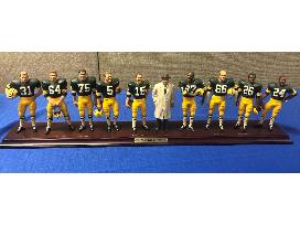 Also a part of this unique package is a figural display honoring the 1966 Super Bowl Champion Green Bay Packers. Ten team members have been rendered in great detail including Jim Taylor, Jerry Kramer, Forrest Gregg, Paul Hornung, Bart Starr, Vince Lombardi, Willie Davis, Ray Nitschke, Herb Adderley and Willie Wood. The display measures 28" across by 4" deep by 7" tall and features a plaque reading "1966 Green Bay Packers" mounted to its wooden base.