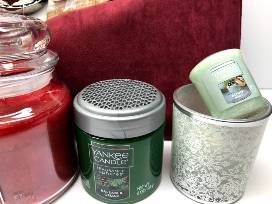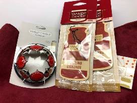 The scents of winter! Large Balsam and Cedar jar candle, Medium Home for the Holidays jar candle, Balsam and Cedar scent beads, Alpine Mint votive and holder, holiday candle topper and 2 Cinnamon car jars.(hanging deoderizers).