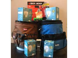 Everything you need to maintain your home! 2 5 gallon buckets with lids. 2 bucket tool organizers. 1 Black & Decker cordless drill. 1 battery operated stud finder. 2 LED flashlights. 4 battery back up LED standard light bulbs from GE - 2 recessed light bulbs & 2 1 multi-tool screwdriver/nut driver. AND a $25 Home Depot gift card.