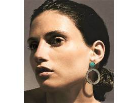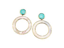 These statement earrings feature a disc in mother-of-pearl that hangs under a turquoise circle, both framed in a fine 18K gold setting. Each stone is polished to a high gloss and shines in a unique combination of color and opalescence.