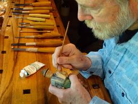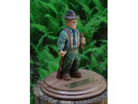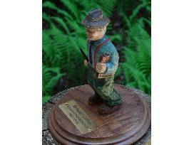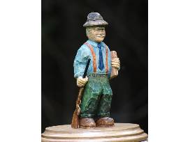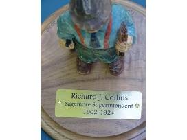 An original carving, " Richard Collins-First Supervisor of Sagamore," by nationally known Adirondack wood carver Rick Bütz . The 6" work shows Richard Collins Sr., superintendent of Sagamore Lodge for A.G. Vanderbilt and later his widow Margaret, holding a ledger book under one arm inscribed "Sagamore Lodge 1902-1924" to represent his years at Sagamore. Richard's other hand holds a rifle commemorating the Collins family story of his marksmanship competition with Alfred. Rick Bütz is the recipient of Wood Carving Illustrated, 2004 Woodcarver of the Year Award. This original woodcarving is the perfect addition to any collection of memorabilia from the Gilded Age of Great Camp Sagamore. (Thank you! Gary Delemester, Great Camp Sagamore Emeritus)
