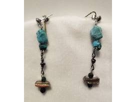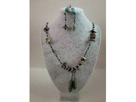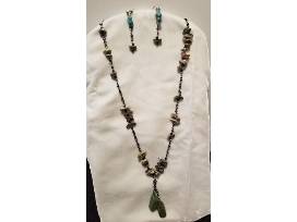 You'll treasure this unique, nature inspired ethnic necklace from AGDesigns, Fort Myers, Florida. The necklace and earing set feature turquoise, and abalone stone chips. The beauty and peace of nature in Florida inspires Anita to challenge her imagination, while traveling back to New York City (her roots in the design business) reenergizes her spirit. The necklace measures 26 "