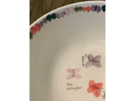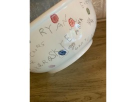 We have a beautiful hand crafted and totally functional serving bowl complete with all the children's names along the outside of the bowl that they wrote themselves. Next to each name is their fingerprint decorated with their own special touch. Inside you'll find our wonderful teachers names and some of their drawings. Will include a gift card to Whole Foods to find the perfect ingredients to use with this bowl to entertain family and friends alike for a lifetime to come!