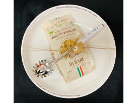 Large white pasta bowel which says "the pasta-bilities are endless" with serving spoon which says "pass the pasta". Includes pasta and sauce for a scrumptious meal.