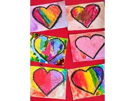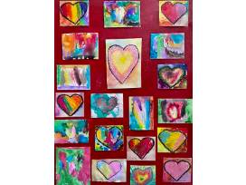 For Mrs. Oefelein's class, the children started making individual hearts with oil pastels, crayons and watercolors. The plan had been to have each child make a heart and then glue them all to a painted canvas, but instead various students started making more and more hearts, dropping them off anonymously on the canvas that one child painted red. Now fully assembled, the individual hearts come together to make a sweet collection of heartfelt drawings.