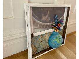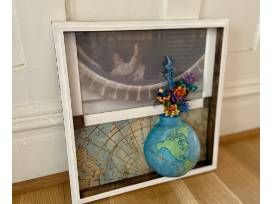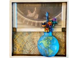 This collage, made by RMS Art Teacher Mo Bennett, was inspired by the view outside of the art room window on RMS's south campus. One day, Mo saw a little toddler relaxing in the circular window peacefully reading a book. After snapping a quick photo, Mo later felt compelled to do something with it. Using leftover paper used by P3 students she created a world collage on half of a bottle to form a vase. Using the same paper, Mo made the flowers that you see coming out of the vase. Mo says the piece is representative of the school, as RMS provides such a fantastic window to the world for all of our students.