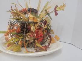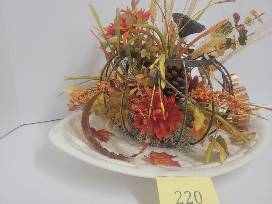 Beautiful Fall floral centerpiece, made by Carousel Florist, atop a stunning turkey serving platter & 2 accent cookie cutters in the shape of a turkey & a pumpkin.