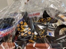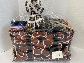 includes fleece throw, can and bottle coozies , tumbler, canvas decor, assorted balloons, keychain coin purse, football, paper plates and much more all in a great football tote. Perfect for the game day fun.