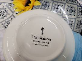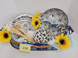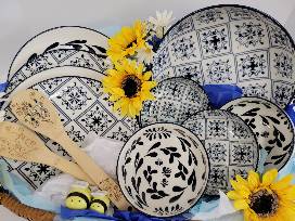 Beautiful blue designed OrlyMaison china set, 4 plates, 4 bowls, large serving bowl, wooden spoons. Adorned with sunflowers & the cutest little set of bee s&p shakers.