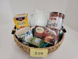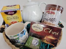 All the fixins for afternoon tea! Porcelain teapot & mug, stress relief hot tea, Twinings Chai tea, mesh tea leaf ball, & chocolate hazelnut Pirouette.