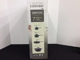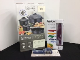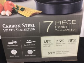 Enjoy cooking up an amazing meal for the family using this 7 piece carbon steel cookware set, 12 piece Cuisinart knife set, and knife sharpener. Set includes a 1.5 qt sauce pan with lid, a 2.5 qt sauce pan with lid, a 10" qt fry pan, and a 5.7 qt stock pot with strainerlid. Also included is a beautifully colored 12 pc stainless steel knife set by Cuisinart. Knife set includes an 8" slicing knife, an 8" bread knife, a 7" santoku knife, a 6.5 " utility knife, and a 3.5" paring knife. Each knife comes with a matching blade guard.