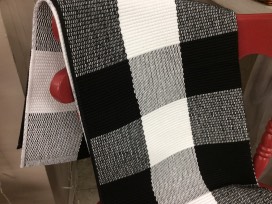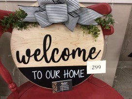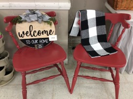 Welcome to our home!! Create a dreamy front porch setting with this custom made "Welcome Home" sign made by local woodworker Kelly Rouse, a woven checkered rug, and a set of wooden chairs.
